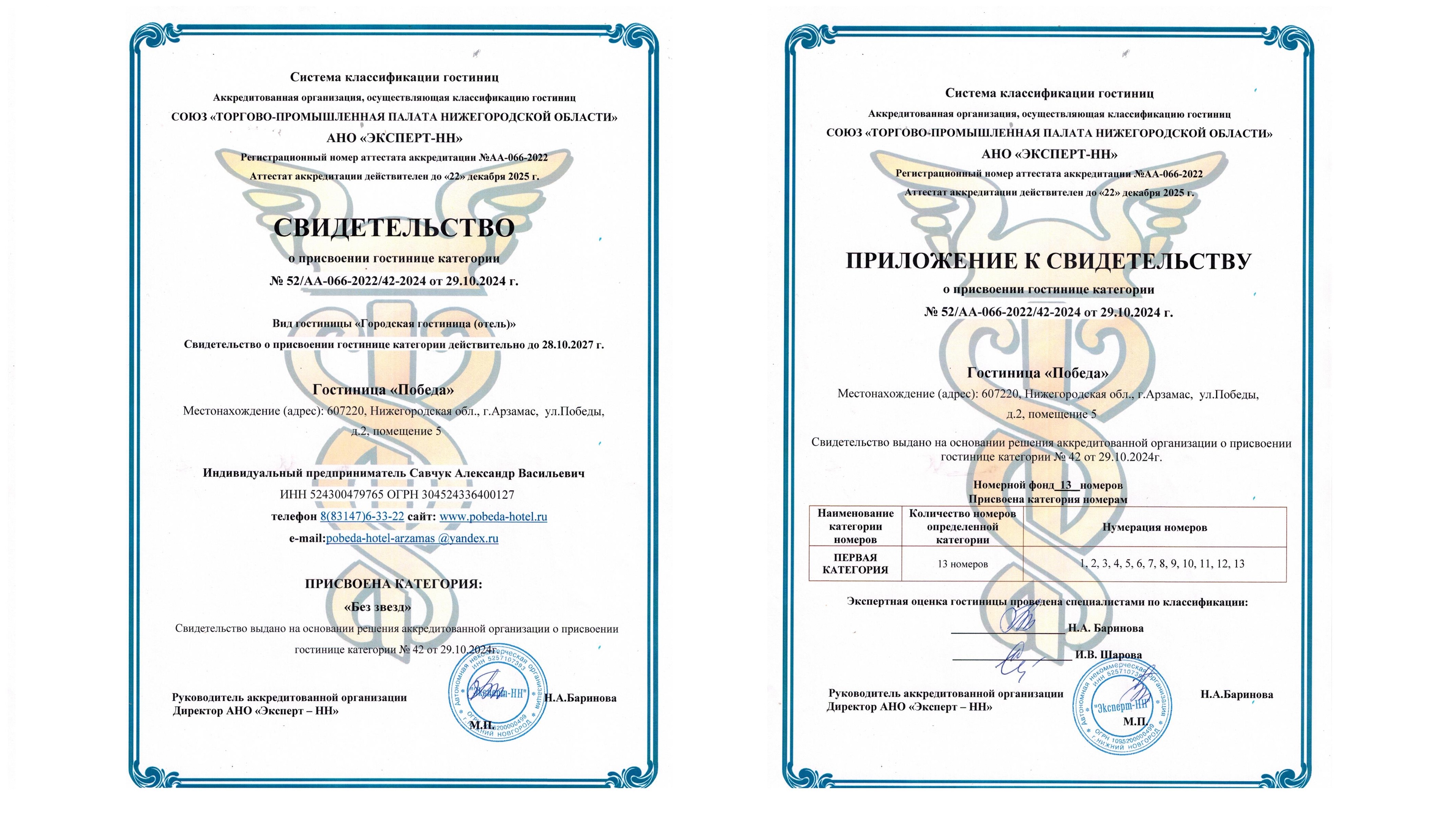 ИП Савчук А. В. Гостиница «Победа» 607220, Нижегородская обл., г. Арзамас, ул. Победы, д. 2 Тел.: 8 (83147) 6-33-22